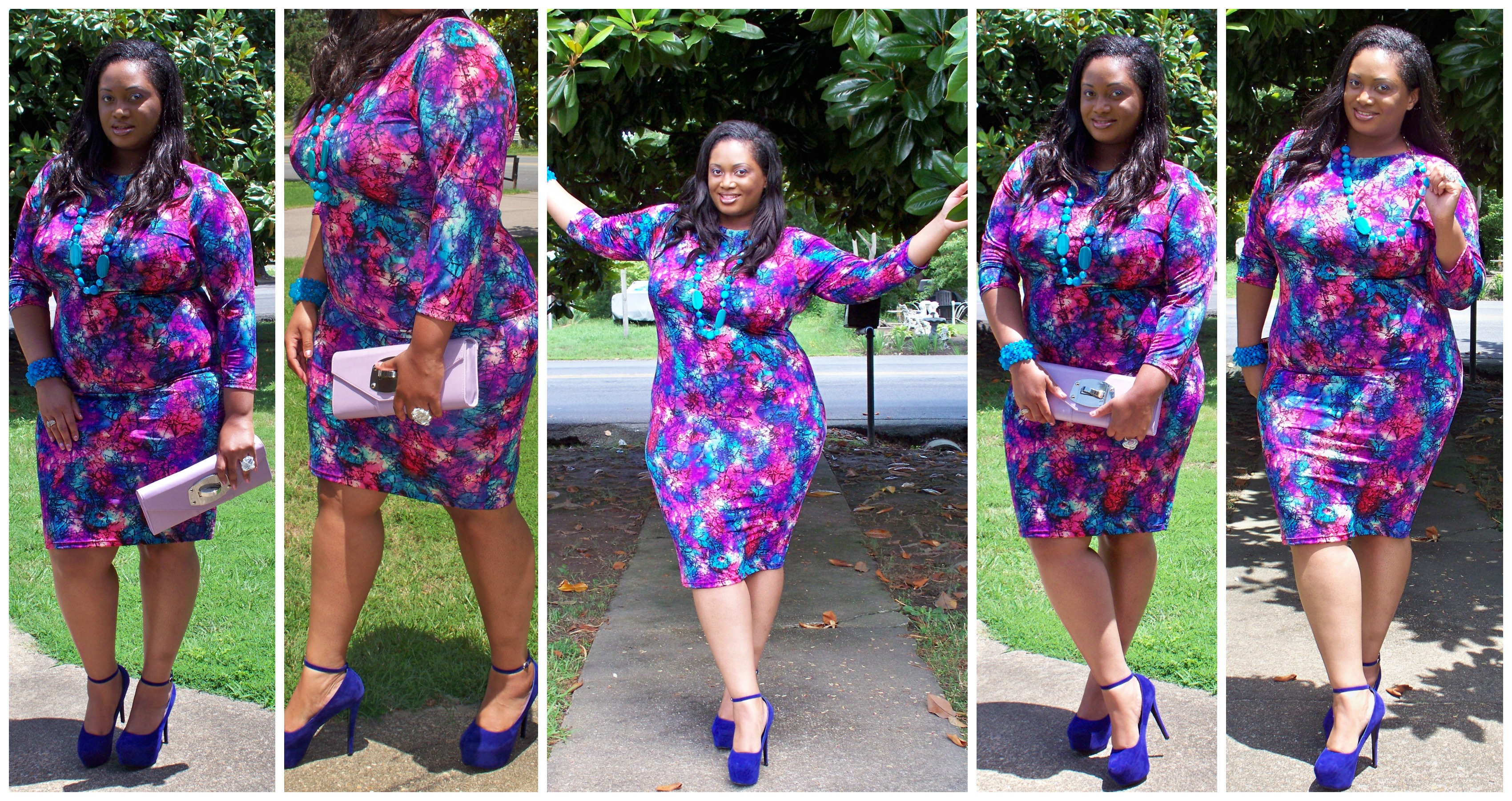 For a double-dose OOTD I changed into this beautiful bodycon dress from Chic and Curvy Boutique called the Watercolor Print Dress, $42, Sizes 1X-3X.  This is the exact same style bodycon that I wore before here. Usually my camera is the pits for me but here recently it really shows up the bright colors in the prints on my dresses. I added these blue Orina pumps ($20) that I scored from Shoe City a while ago and they’re appearing sorta purple in the pics. But it still all goes together pretty well and the turquoise necklace and bracelet (from It’s Fashion) picks up that hue from the dress too. There is a faint bit of lavender in the Watercolor print and I needed a reason to finally wear this clutch that I picked up from Charming Charlies way back in the Spring. The clutch was only around $25 and it still should be in store but just go to the pastel section since Charming Charlie’s is a color-coordinated store. Now last but not least is a goodie I received from a gift bag while at FFFWeek. It’s a ring from the Mint Jelly Jewels company.  I like this ring because its bold and a statement piece all on its own on your finger. Be sure to check them out for unique handmade pieces.