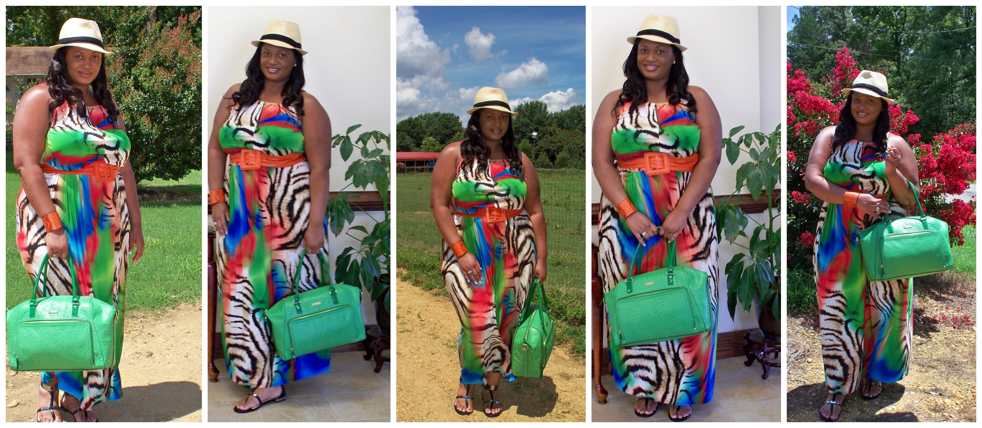 To coordinate with the animal print and bold coloring in the dress, I added a wide orange belt and a bright green ostrich Kate Spade bag, worn before here and here. I grabbed this Straw Fedora, $22, from Aldo while out at the mall yesterday. I had to buy a mens hat because they always run fuller and allow for me to have the ‘extra hair’ under it. (Style Tip: To avoid sweat and/or makeup on your hats, wear a wig cap over your hair under the hat). I kept the shoes flat and simple by wearing sandals from the Prabal Gurung collabo from Target earlier this year.