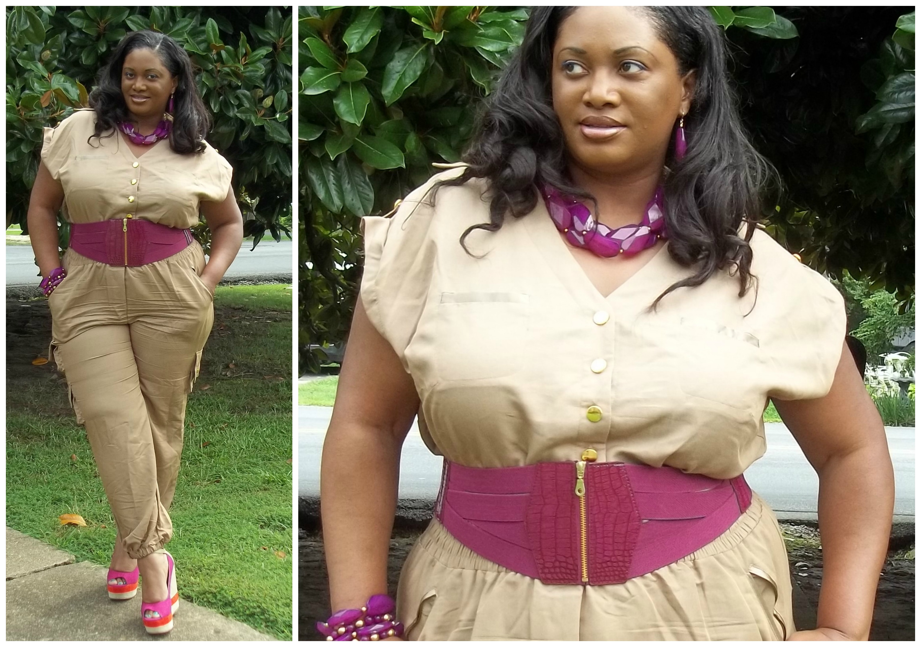 This past Saturday I was a panelist for the Bowie, MD Plus Night Out Model Search at Ashley Stewart. My original plan was to change clothes after the event when we went out to dinner. But it was soooooo hot on Saturday I couldn’t fathom the energy to do so. But my second outfit of that day was supposed to be this Tan Military Jumpsuit by Ashley Stewart, $59.50. I didn’t want a good outfit choice to go to waste so I’m showcasing it today instead. During the model call I actually styled one of the model hopefuls in this exact same jumpsuit for her to try-out in. (Tip: When casting for a particular clothing line as a model, it would be wise to actually wear that brand to the casting so that the panelists can actually see how that brand of clothes fits on you. More casting tips HERE). Anyway, this jumpsuit is the most sought after outfit from the newest Ashley Stewart collection called, “Military Glam”. (It also comes in green as shown below). Now I will suggest going up a size in this due to the rayon/polyester material and be sure to really iron it thoroughly before wearing because it does wrinkle fast, as you can see in my pics. I always like adding a fancy belt to my jumpsuits when possible and I wanted a color to really coincide with the tan. So I paired up this burgundy belt, $16.50 by Ashley Stewart, and jewelry in the same color tone also by Ashley Stewart. (Available in-store only). The elastic gathering at the bottom of the jumpsuit allows for your shoes to show-up really well, therefore I went with these color-block wedge sandals from Dots Fashions.