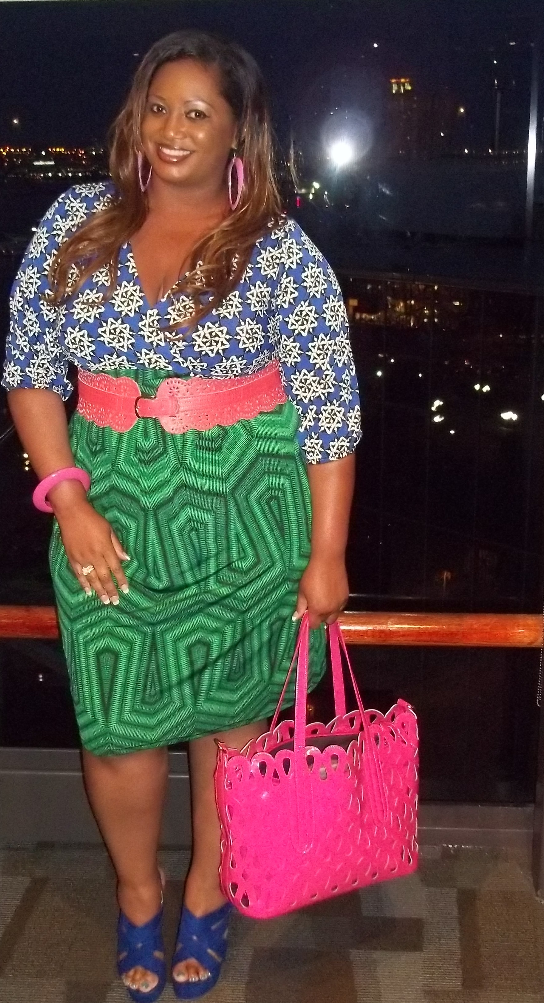 I just got into Baltimore today to attend the Curves Rock Fashion Weekend of events and the first function for me was the Curvy Monologues and Mixer tonight at the Rooftop of the Hyatt Hotel. Upon arriving, I walked into a room full of curvy divas doing inspirational spoken word and poetry. The event then went right into the mixer where I mingled with models, photographers and vendors. Since I’m honored enough to be the ‘Brand Ambassador’ for Simply Be again this year for this weekend of events, I’m wearing an Anna Scholz Print Dress, Now $79 for tonight’s festivities. This dress was not only wrinkle-free and comfortable, it is a statement piece due to the mixed-prints trend in the colors of blue and green. Since the dress reminds me of a kaleidescope, I added pink accessories, including this pink tote, which is also by Simply Be. I rounded it out with blue sandals for that 70’s vibe. I’m super-duper tired so therefore I will add more pics to this post tomorrow 🙂
