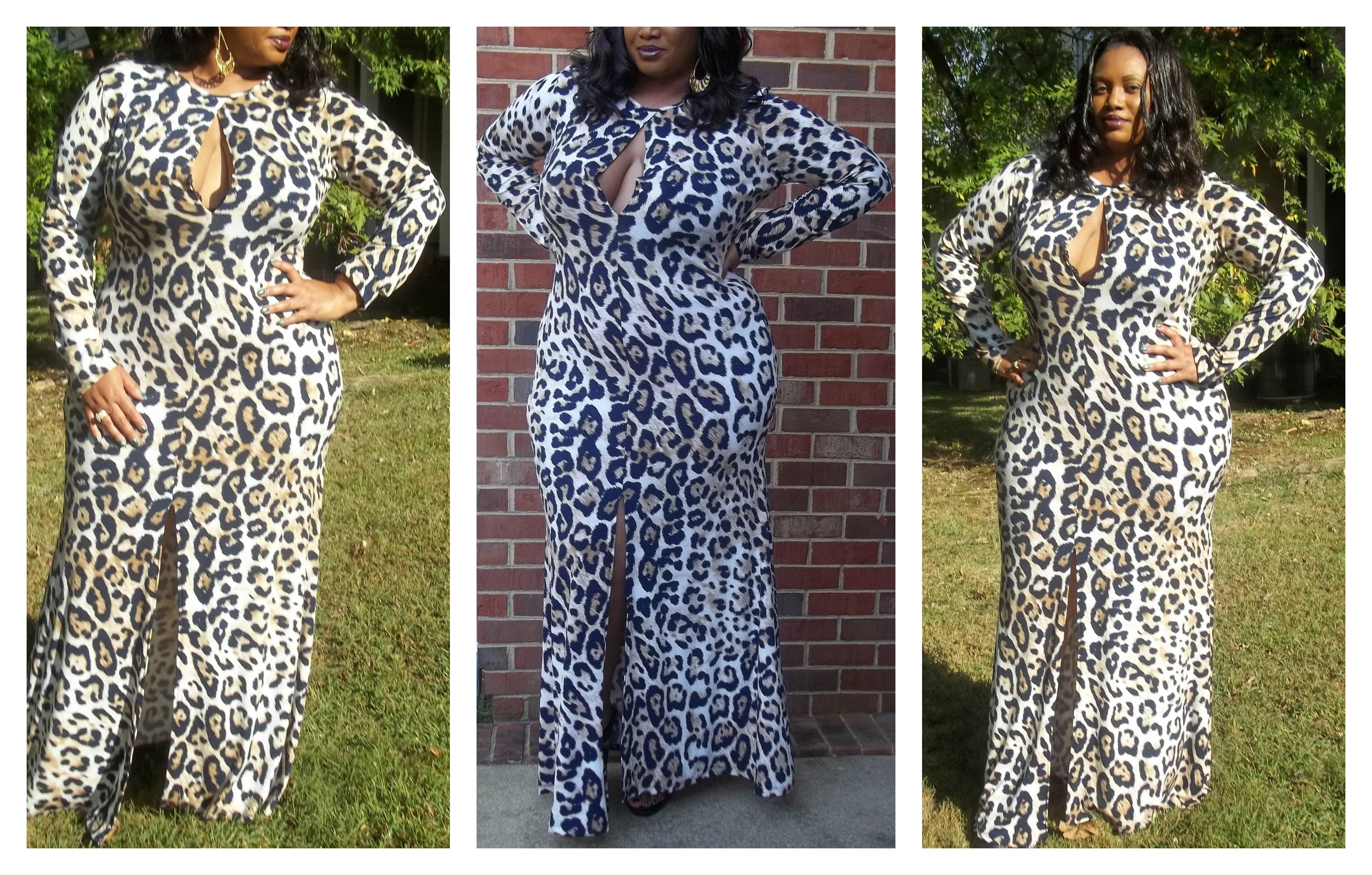 Today I got a chance to wear this ultra-sexy peek-a-boo style keyhole gown ($55) from Chic and Curvy Boutique. It comes in various colors but I chose the unique color combo of navy and brown animal print. The dress has a daring bust-line to it that you MUST wear a push-up bra with. If a figure-flattering, sexy look is what you’re going for then this is definately the dress for you. I’ve always been a fan of rich navy coloring and that drew my attention to this gown. Therefore it was the perfect time to pull back out my navy and gold sandals that designer Christian Siriano made for Payless a few years ago. I then added a navy and tan Nicole Lee bag to complete my look. As an additonal style tip, add a wide belt, preferably in navy, to accentuate the waistline of the dress if you prefer.