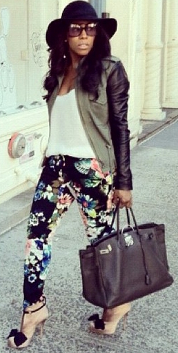 Last night I was watching the movie “Zero Dark Thirty” and it partly got me to thinking about how fashion is now being inspired by military looks. One of the top trends for Fall is the military jacket with leather sleeves. Ironically, Chic and Curvy Boutique had just sent me their version recently which is only $45. So I paired the jacket up with these black and white leggings from Empress Footwear. The unique thing about these leggings are the fact that they are custom made for you according to your measurements all for the low price of $45.99 (available in straight-sizes and plus-sizes). (Not to mention the fact that they are named after me and are called the “Checked by Bella Leggings”). I wore a matching black and white peplum top with a brown print belt underneath the jacket so that I would still be matching my booties (by Charlotte Russe) even when I took off the coat. Check out below fashion stylist to the stars, June Ambrose, rocking her leather sleeved coat with floral pants, hotttt!!!!