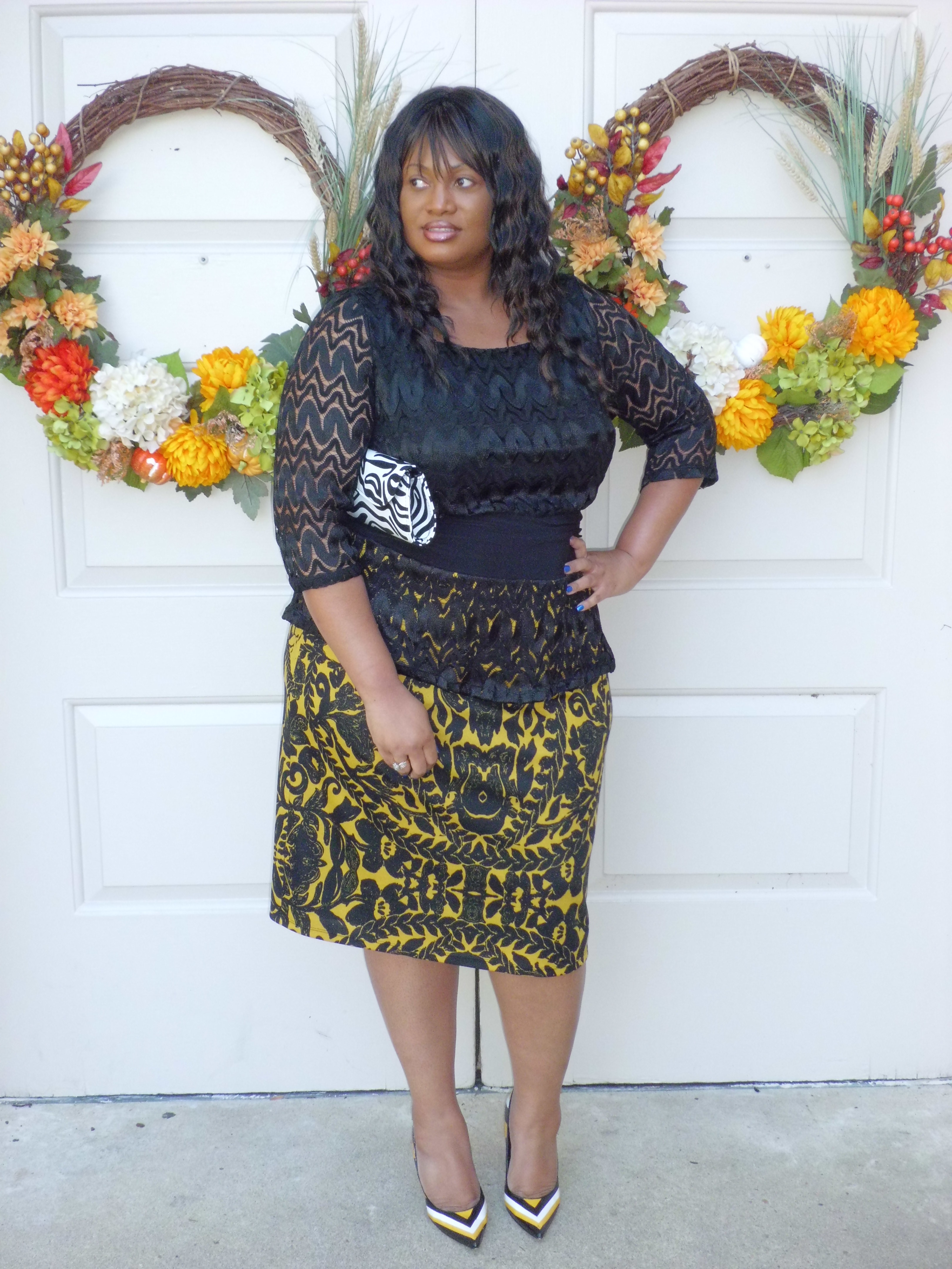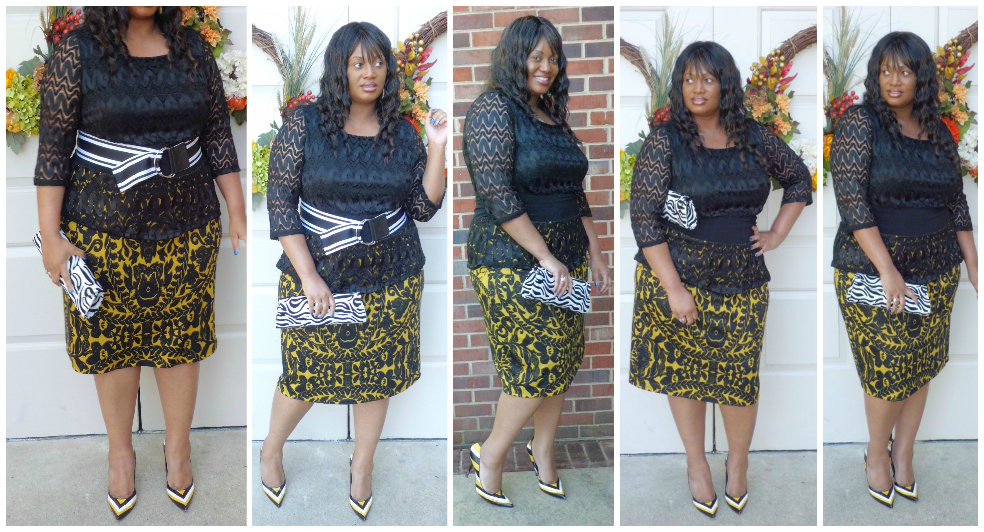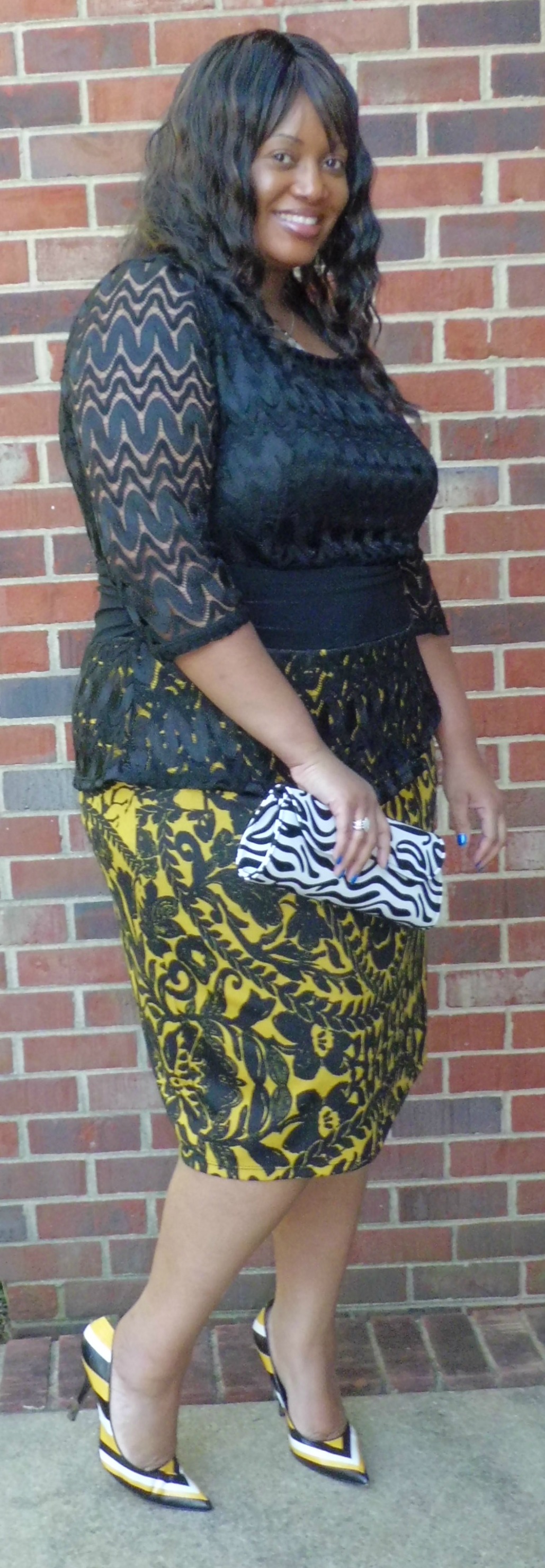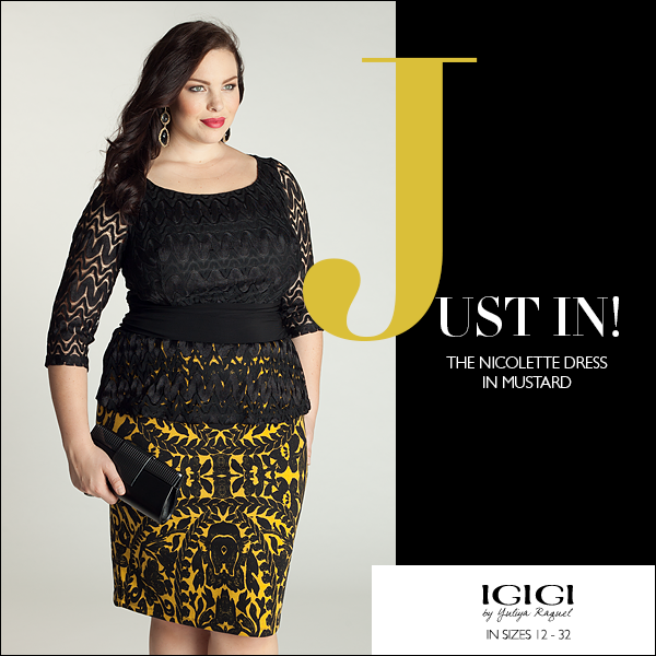 I recently got a chance to wear the Nicolette Peplum Dress from IGIGI by Yuliya Raquel. It is from the “Discovering Fall 2013” collection. At first glance of this dress online I already knew exactly what shoes that I wanted to pair it with. A pair of yellow, white and black Carlos Santana pumps. I then added a black and white belt and a swirl clutch from Rainbow ($12.99) for a contrast to the yellow and black coloring in the dress. I have to be honest, this dress is very chic and easy to wear. No zippers or anything tugging. It glides on over the head with ease and being that it is fully lined makes it a comfort to wear. Peplum can sometimes look like 2-pieces but the Nicolette dress is a one piece and the top portion is made of lace and the bottom skirt part has a soft stretchy cotton feel to it. I would definitely make this a Holiday dress purchase for certain. it is $180 and comes in sizes 12-32. Shop at www.igigi.com