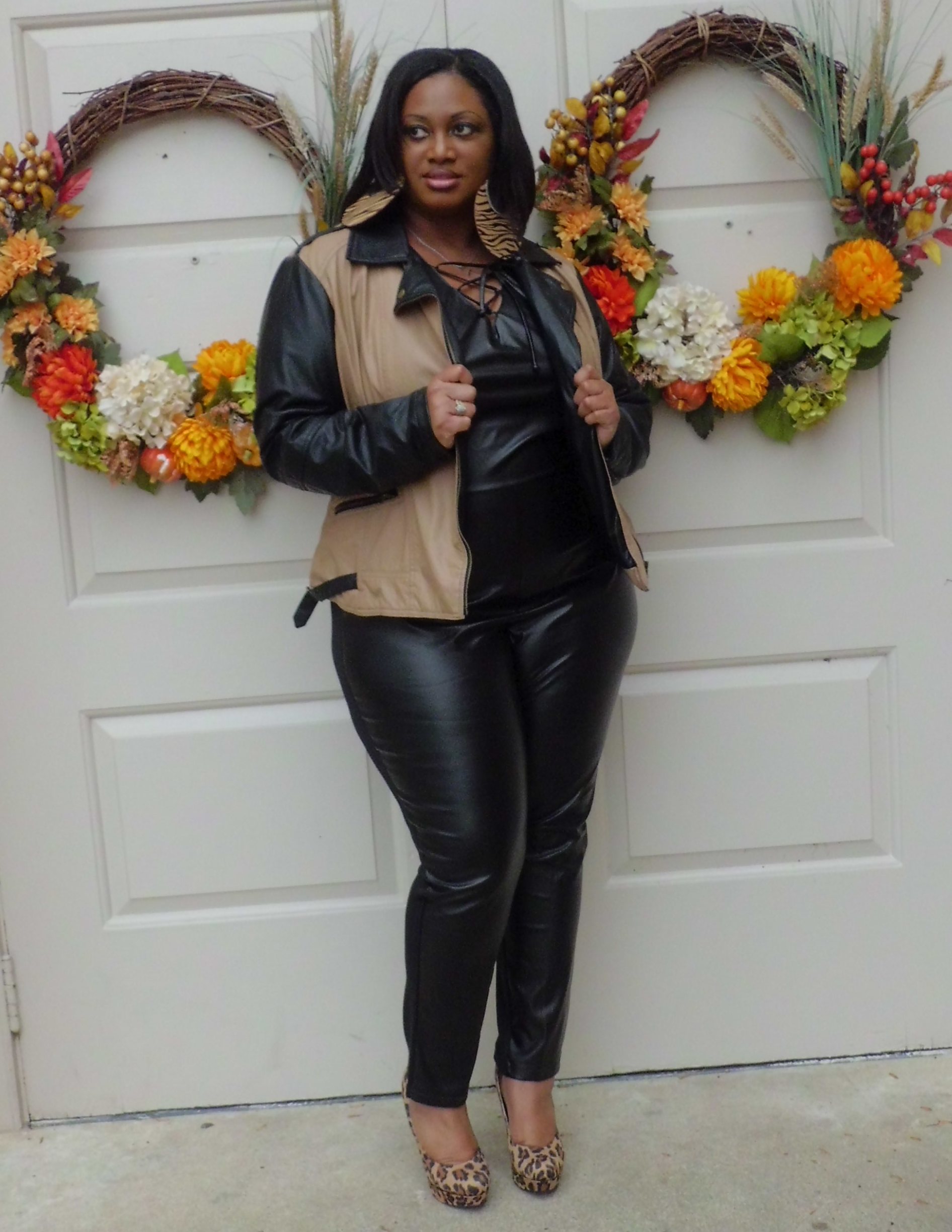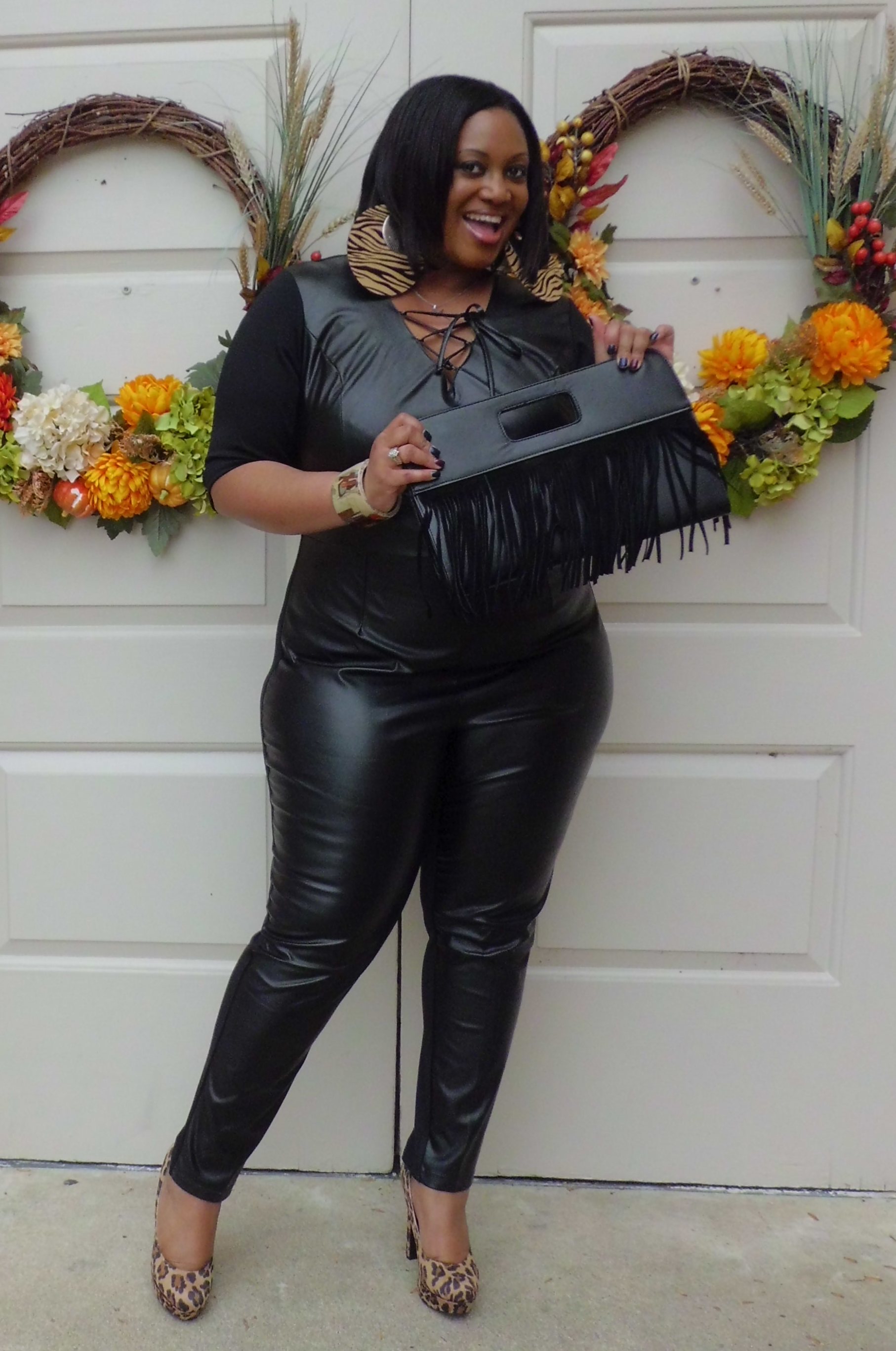 Even though Halloween was last week I wore my ‘Cat-woman style costume’ today instead. I’m just joking but in all seriousness catsuits/jumpsuits are all the rage right now and I couldn’t wait for this particular jumpsuit to hit the stores finally. It is the Ponte and Faux Leather Jumpsuit by Ashley Stewart. It was shown on the Full Figured Fashion Week runway this summer and I’m surprised there wasn’t a waiting list for it. The faux-leather trend is “the thing” right now and in addition to faux-leather joggers, skater skirts and shorts, the faux-leather jumpsuit is a winter must-have. I featured this one by Ashley Stewart recently as a Tamar Braxton Look for Less and I decided to try mine out today.
