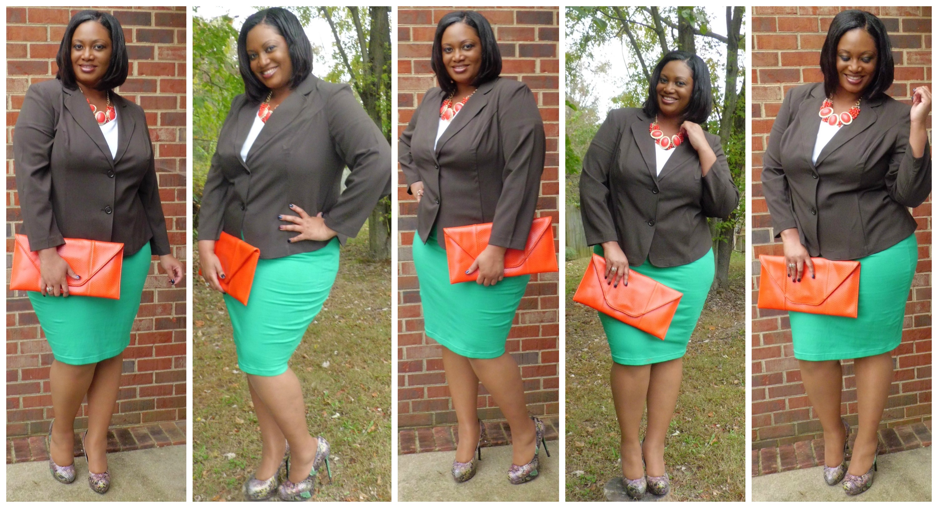 So to switch things up a bit for this edition of Fashion Friday’s, I’m focusing on the JMS Two Button Blazer in Chocolate (Style #24811, $37.99, Sizes 14W-32W). This blazer can be worn a few different ways and I’m first going to show how to pull it together as a suit. I wore mine with the Counterparts Tummy Control Full Comfort Waistband A-Line Skirt in Heather Mocha (Style# 24295, $19.99, Sizes 16W-24W) and the Just My Size Silky Button-Down Printed Shirt in Jungle Print (Style#25520, $21.99, Sizes 1X-4X). I purposely didn’t match the blazer and skirt, although they both come in various colors, so that I could style them with these tan suede knee boots and snakeskin clutch. The blazer runs full so I would suggest going a size down to ensure that fitted appeal once you have it on. Also the A-line skirt is an ideal choice if you have a larger middle area because there’s a tummy control paneling made right into it.