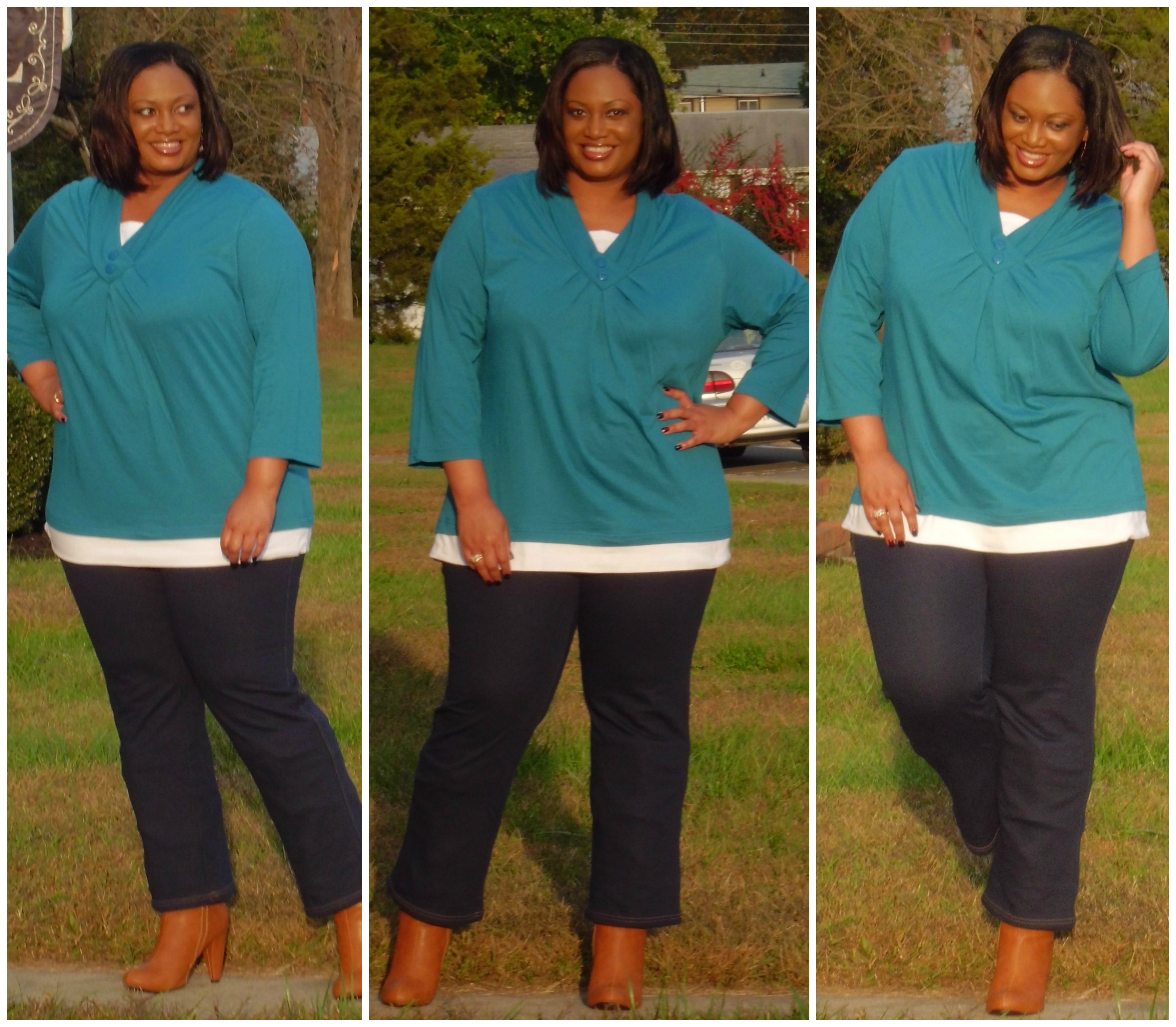 Then once you’ve come home and have relaxed a little bit from all of that shopping, I’m sure more family and perhaps out-of-town guests will be stopping by throughout the Holiday weekend. Well you can switch up the look a bit and make it a tad more dressed up by adding a pair of heeled boots with this JMS 3/4-Sleeve Two-Button Two-Fer Women’s Top in Seaport (Style #25351, $21.99, Sizes 1X-4X). That way you can remain both stylish and relaxed in the pajama jeans. (I would suggest ordering at least two pair of the pajama jeans to always have a backup when one may be in the laundry!). The cotton Two-Fer top looks like two separate layers, so it appears like you’re wearing a longer tee underneath, but it’s actually one simple top.