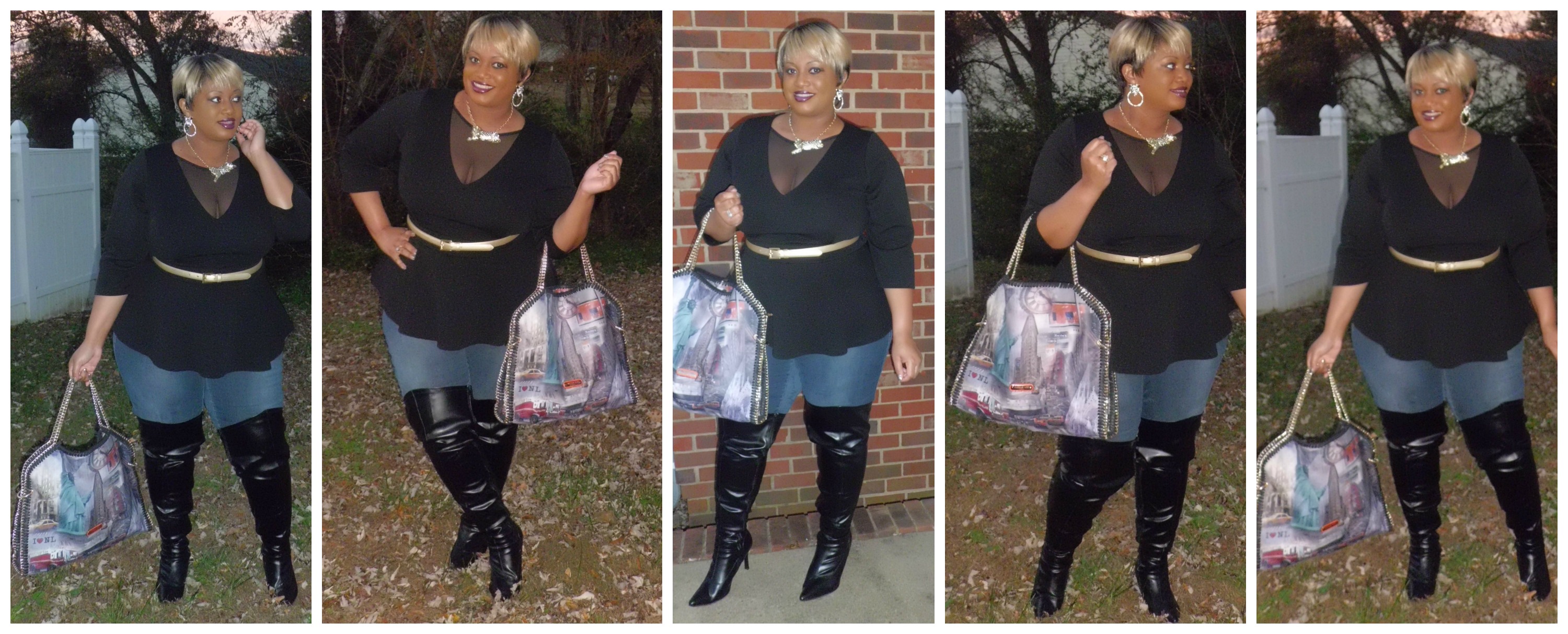 For the event I went glam-casual. I’m wearing a City Chic Peplum Top with a gold skinny belt, a pair of dark wash stiletto jeans and black thigh boots, both from Torrid. I bought these boots about 5 years ago but there is a similar pair on the Torrid site here. (Note: These are NOT the same boots that I wore in my “RISQUÉ ME” post). But my entire outfit was based around the handbag. If you haven’t noticed by now, I have a grand collection of Nicole Lee handbags. This is a new one to the site called the DAVIDA NEW YORK PRINT SHOULDER BAG ($86.99). The PR department for Nicole Lee contacted me for a review and the Davida bag was my top choice.