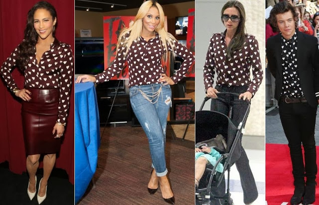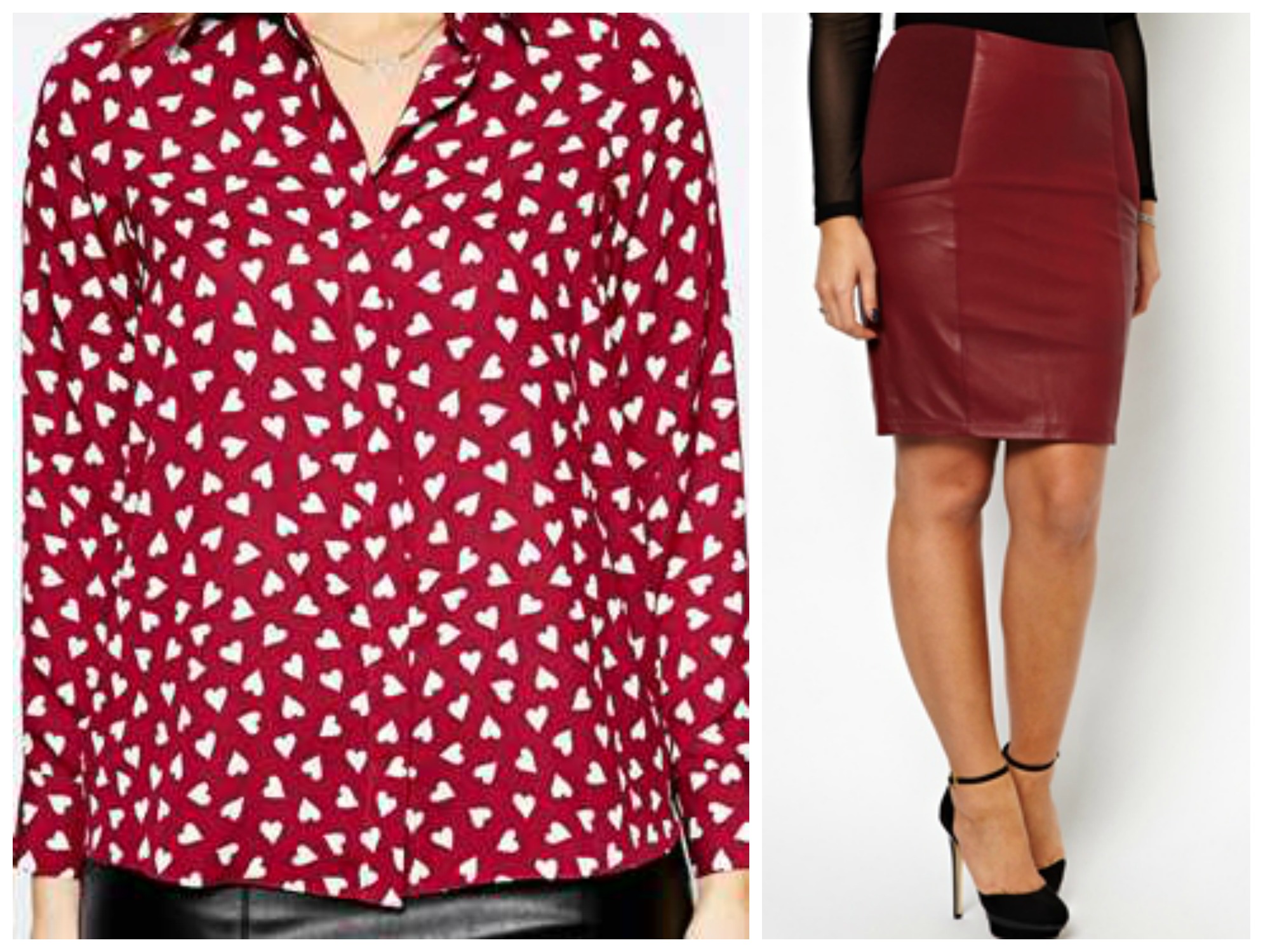 Here’s another post that I’ve been meaning to write for a while now but just never got around to it. I kinda forgot, but thanks to blogger buddy Kurvy Katie for reminding me the other day on Facebook with one of her post, I remembered. In the Fall 2013 Burberry collection there’s a burgundy shirt made with hearts all-over it that retails for $704. Celebs such as Tamar Braxton, Victoria Beckham and even Harry Styles have been seen sporting the shirt. Of course Burberry doesn’t go over a size 14 but Asos CURVE definitely does. The Asos brand has a very similar style called the Exclusive Shirt In Heart Print that retails for only $64 and is available in sizes 14-24. I figured this would be a wonderful Valentine’s Day outfit choice. There’s even a burgundy pencil skirt In leather, which Burberry sells for $1,130, that Asos also has similar to the Burberry brand for only $66. (Actress Paula Patton is wearing the Burberry skirt with her hearts shirt in the above pic).