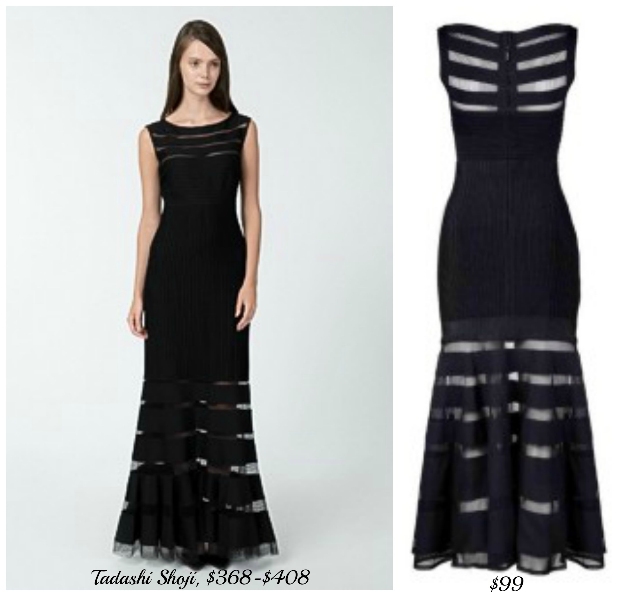 A couple of years ago I was honored to be a part of a blogger styling challenge presented by designer Tadashi Shoji. Myself and other bloggers styled up the Pintuck Jersey Gown in Black. I love this gown and although I haven’t worn it but once, it is a fave of mine. The fit and quality are superb. Many celebs have also been seen wearing this gown at various events. But the Tadashi gown retails for $368 in straight-sizes and $408 for plus-size. Now I know that may be a pretty penny for the everyday girl to splurge on so I found a great replica version today while cruising online. It is the Black Long Sheer Bandage Dress from Boca Celebrity Boutique. This dress retails for only $99 and comes in sizes S-L.