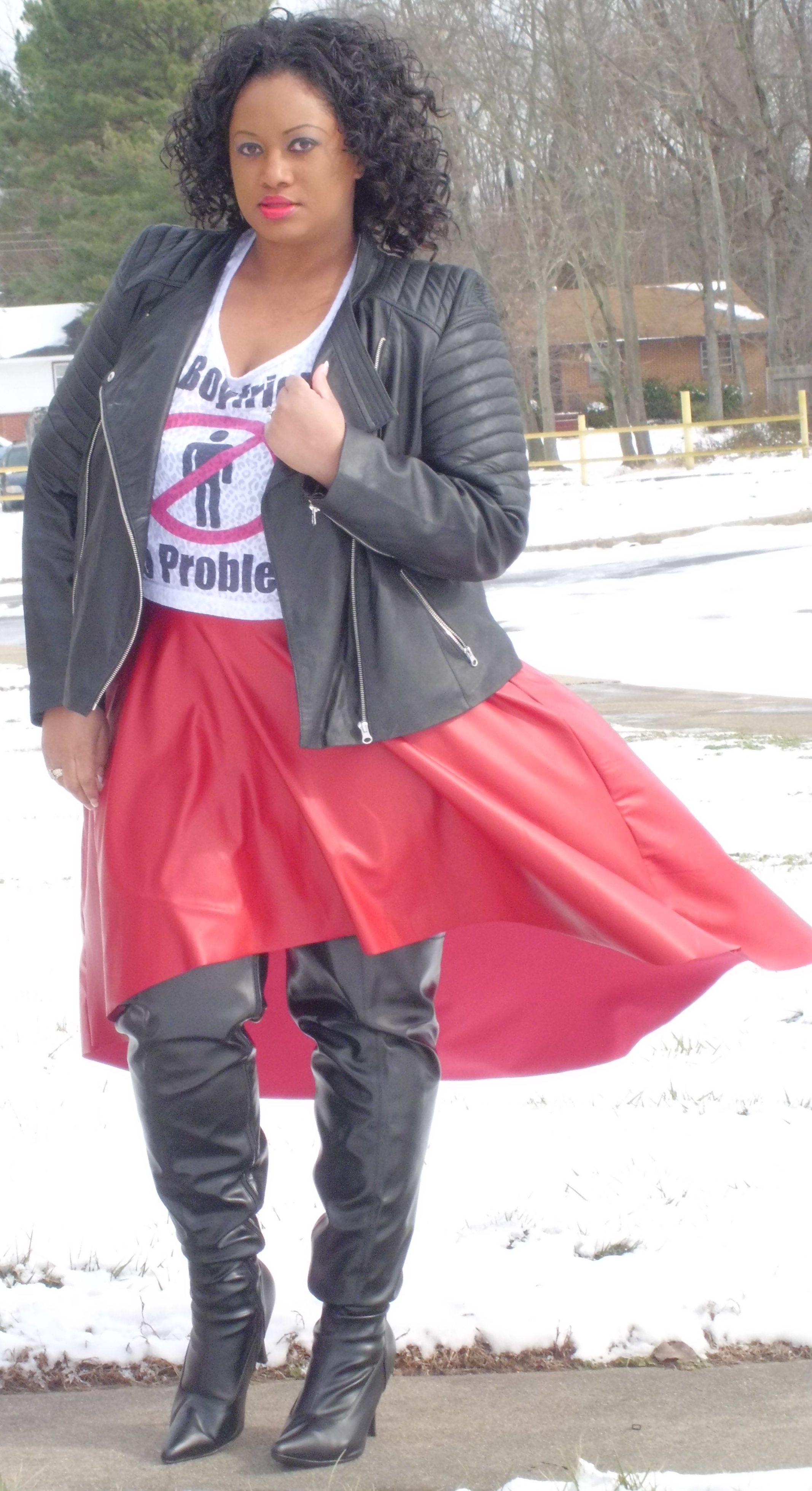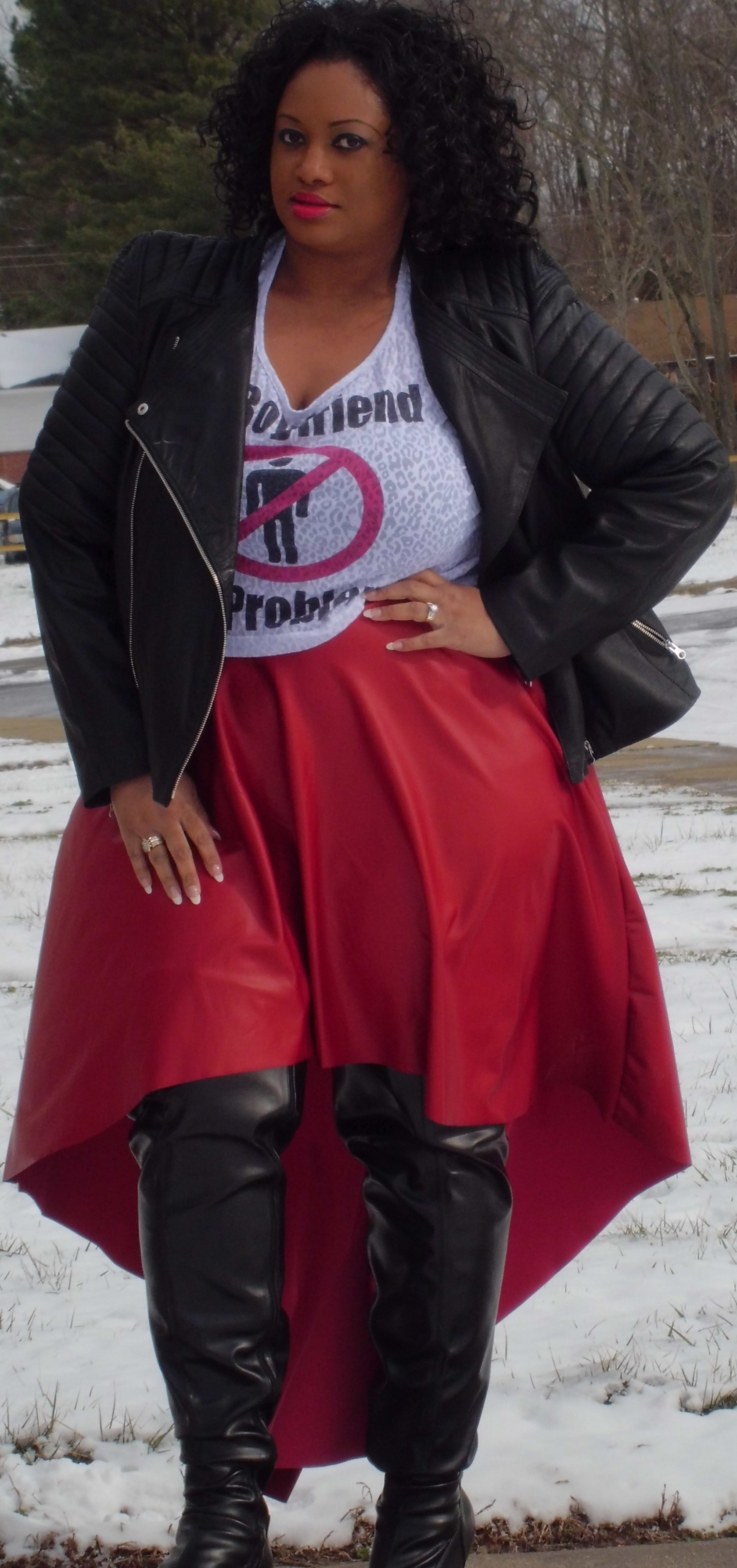 I paired up the top with this RED HI LO FAUX LEATHER SKIRT from Boutique 115. You may recognize this as the skirt that is similar to singer Tina Campbell’s that I blogged on the other day. The skirt is only $37, goes up to a size 3X and also comes in various colors. Tina wore her black skirt with tall black boots and I’m wearing the red one with similar thigh-high black boots. To keep up the edgy theme, I topped it off with the ASOS CURVE Exclusive Premium Leather Biker Jacket ($222.23).