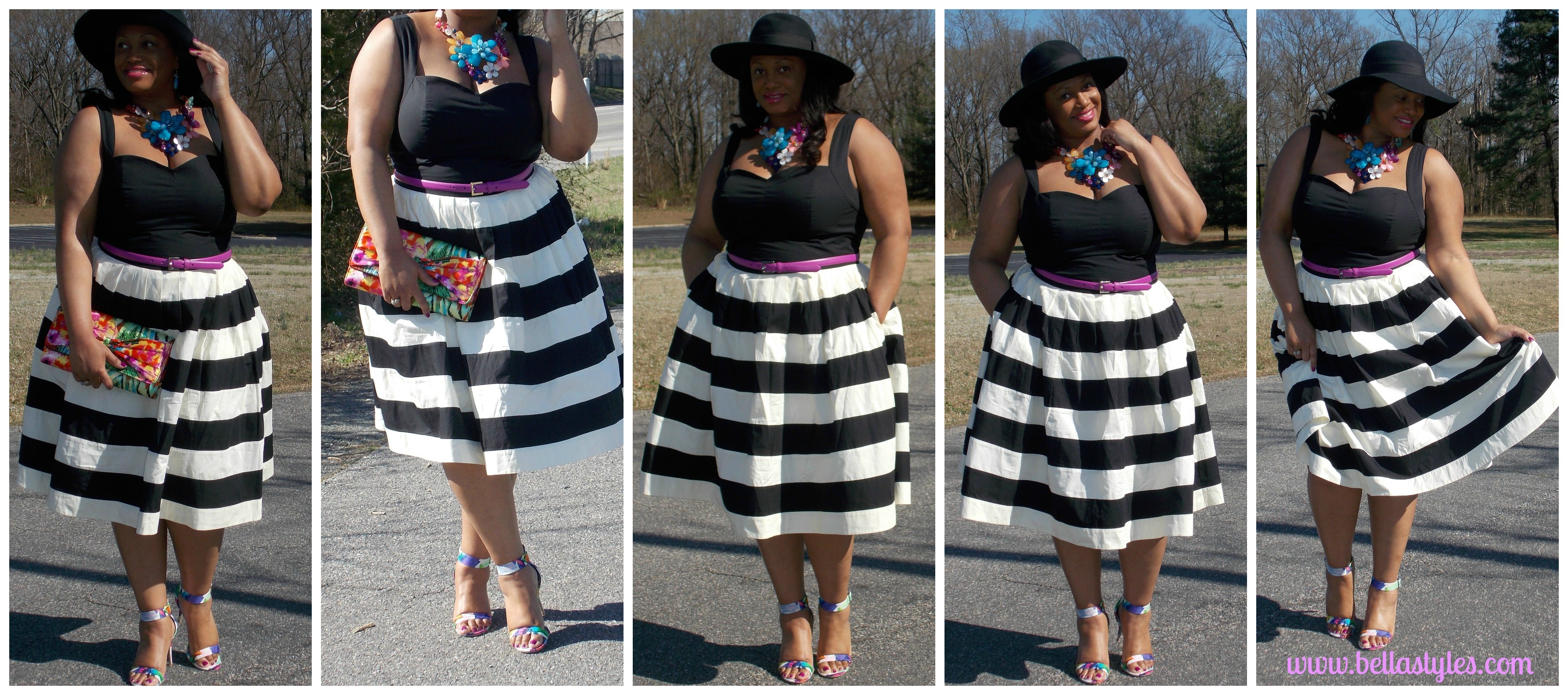 Of course black and white is the number one color trend of the moment and no I didn’t stray away from the horizontal stripes either. But to also incorporate a mixed prints trend, I added a floral clutch and coordinating floral ankle strap pumps. (These are the same pumps I blogged on as a look for less to Steve Madden). I also wore a floral statement necklace and earring set that I scored in NYC last week for only $8.99 at my fave jewelry store, Earrings Plaza. I wore a hat because the wind was blowing so and I wanted to keep my tresses in place for these pics. To add a little more definition to the dress and cinch the waistline, I added a fuchsia toned skinny belt.
