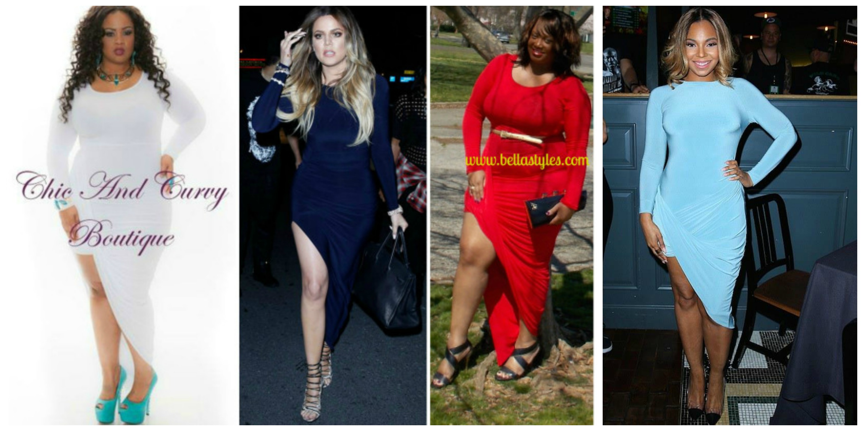Speaking of a look for less, I just spotted reality star, Khloe Kardashian, in an asymmetrical dress that is similar to mine and guess what, it’s in the gorgeous color of navy. The dress that I’m wearing from Chic and Curvy Boutique comes in other colors too as shown below. Hmmm, maybe I can borrow her dress to match my clutch and sandals. Wishful thinking huh?