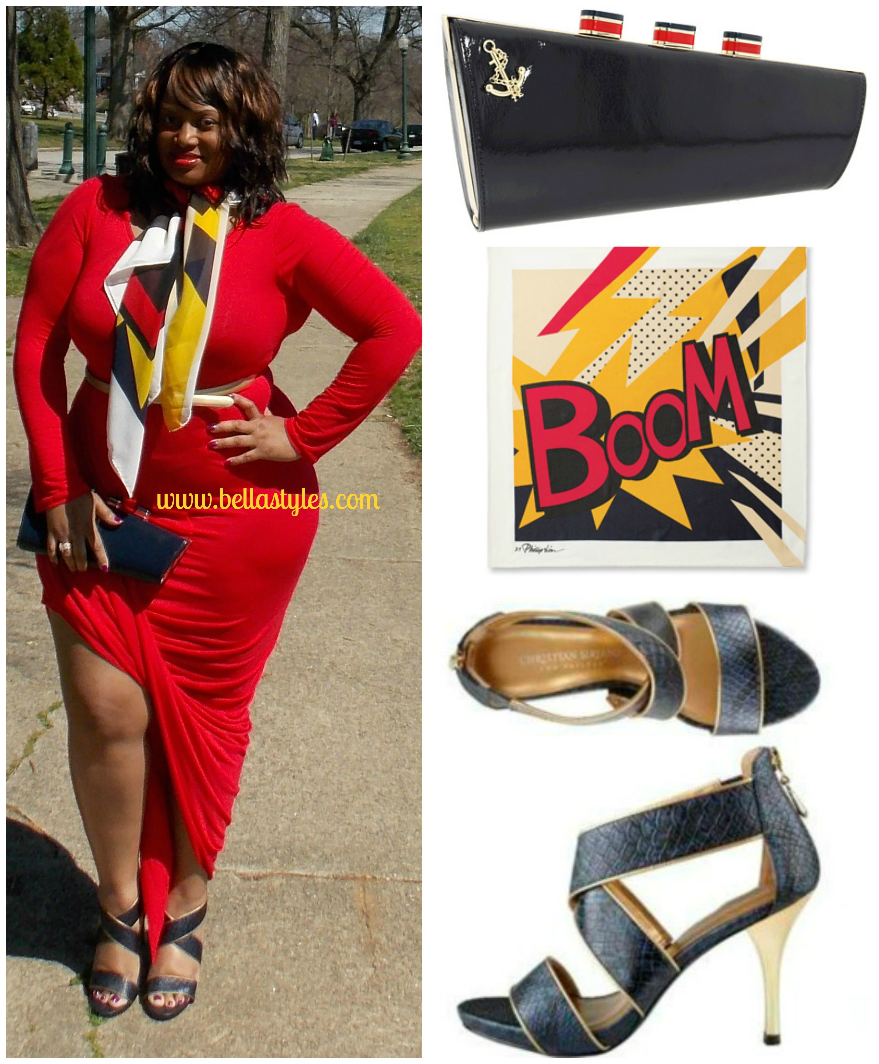 Today would have been a beautiful day to go sail boating. But since I don’t live near water I could only wish for it. So I decided to dress up as if I were going on a nautical affair and went all American in red, white and blue…with some yellow. I’m wearing the Red Long-Sleeve Dress with Gather and Drop Effect from Chic and Curvy Boutique ($44). It’s an asymmetrical piece with slight ruching in the middle. Ruching can be a curvy girls best friend. The dress is very clingy and form fitting so I highly suggest wearing a one-piece shaper underneath to smooth out any ‘bumps’. (Mine had lace on it which can be seen in the pics so take my advice and wear a smooth shaper). You can hike up the sleeves or wear them long as I did both to demonstrate for you. This is a very sexy dress and if you have the curves to fill it out, this is for you. Adding a skinny belt defines the waistline and instead of jewelry, I wore a statement scarf and clutch instead.