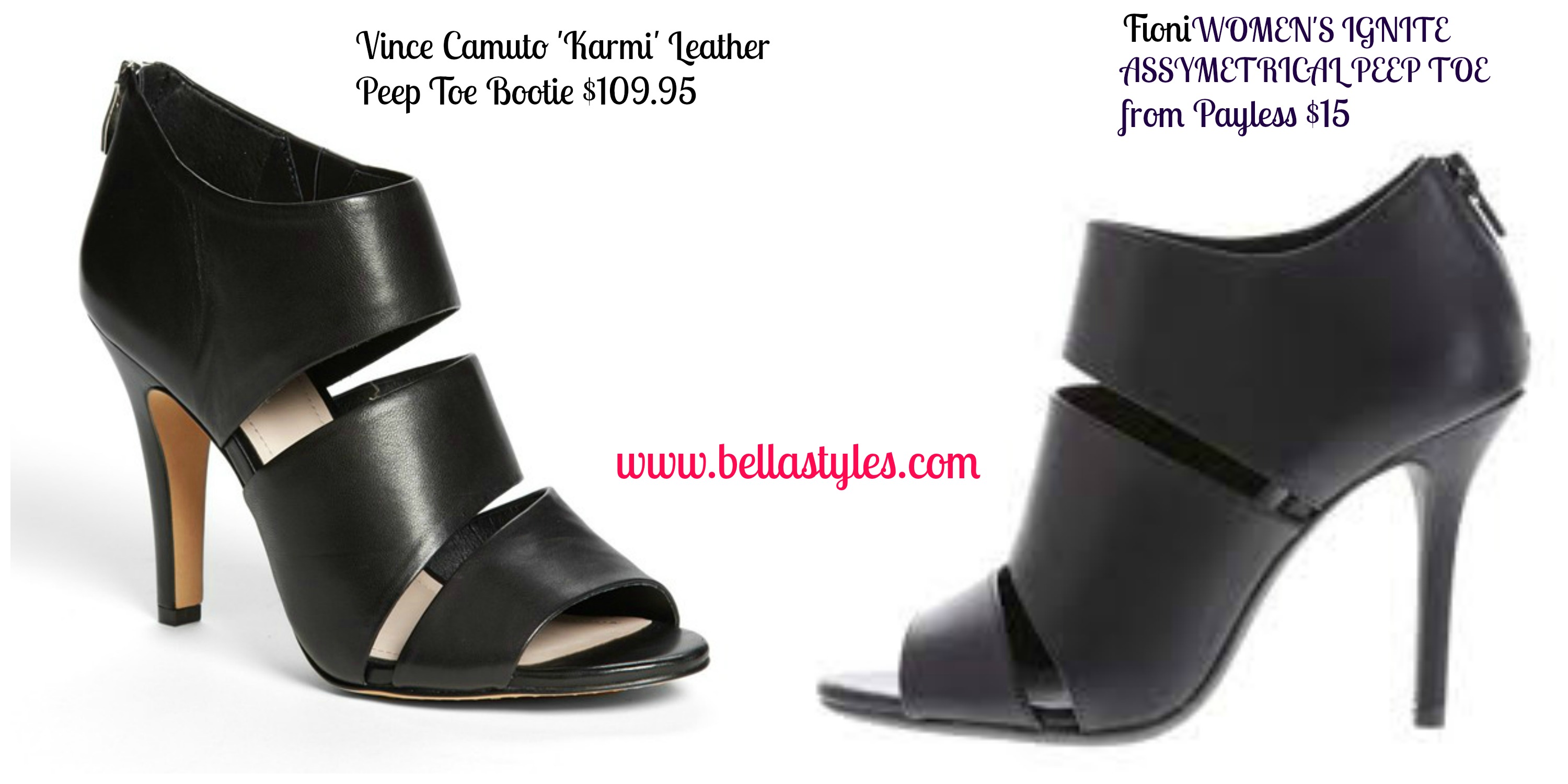 A while back I said that I would do a look for less blog on a pair of black booties that I wore in another post. Well I’m finally getting around to it now. The designer pair is the Vince Camuto ‘Karmi’ Leather Peep Toe Bootie that retail for $109.95 and are available in sizes 5-11. But Payless has a VERY similar pair called the Fioni WOMEN’S IGNITE ASSYMETRICAL PEEP TOE that are on sale now for only $15 down from $39.99. Plus, they come in sizes 5-13 and are part of the Payless BOGO sale. These are really a great look for less deal!