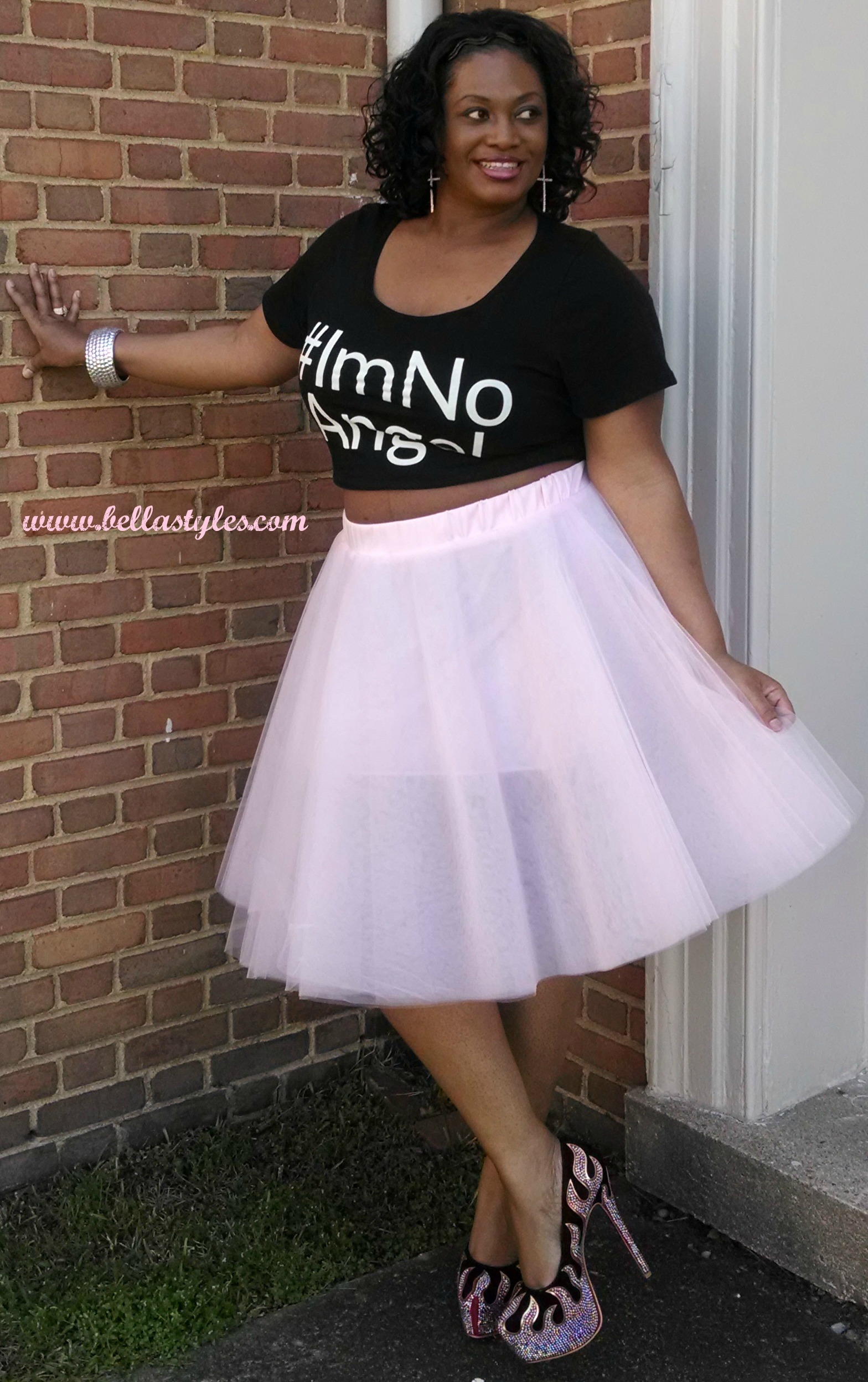 I was just saying to myself last week how could I get my hands on one of these tees and what do you know, to my surprise I received one in the mail directly from Lane Bryant later that day. So myself and other bloggers have been styling our tees all week to show our support and today I’m wearing mine, as a crop top, with a trendy tutu skirt and flame platform pumps. (I was empowered to be brave and show a lil stomach just 4 months after having a baby). For those that have been asking, YES, the shirts will be available for all to purchase in Lane Bryant stores next month.