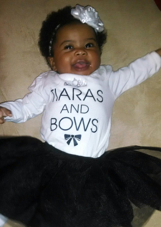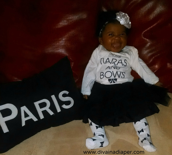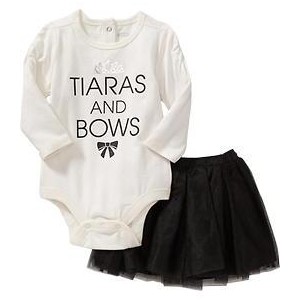 Baby Bella received this outfit as a baby shower gift back in October before she was even born. So unfortunately, it’s already sold out at Old Navy but it was just too cute not to share. It’s the two-piece onesie and tutu inscribed with “Tiaras and Bows” across the top. I paired it with matching bow tights from Janie and Jack and a Poof Headwrap from Babies R Us.
