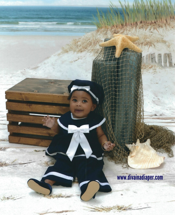 Lil’ Diva celebrated turning 6-months old with a nautical themed photoshoot. Her outfit is a navy sailor suit by Rare Editions. It is originally sold in stores like Macy’s or Dillard’s but this was a bargain find at Once Upon A Child. Once Upon A Child buys and sells gently used kids’ clothing, shoes, toys and baby gear offering you the opportunity to recycle your children’s nearly new items and get paid on the spot. As for her accessories, the gold bangle is from Kohl’s and the shoes are by Gap.