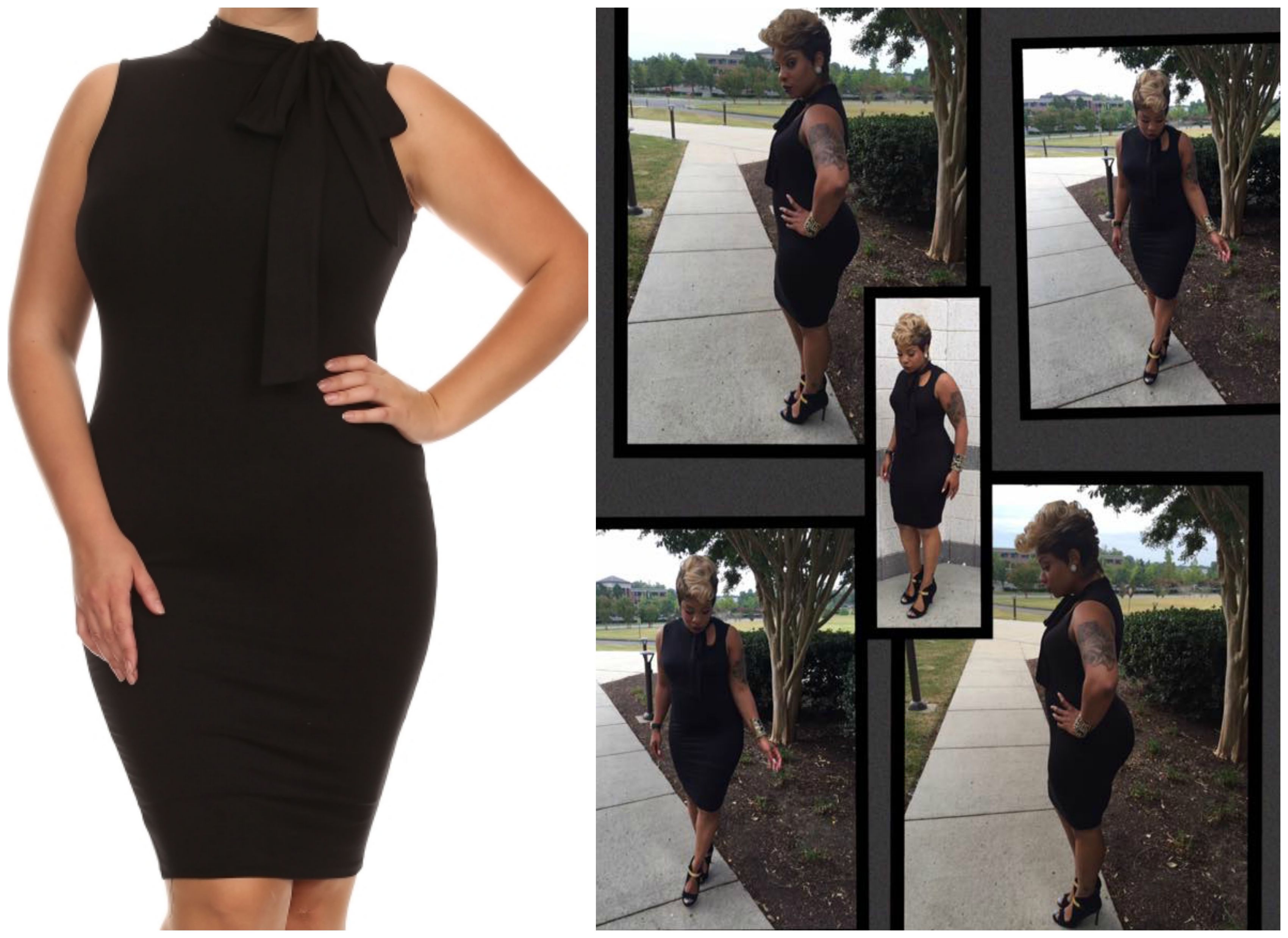 P.S. My second choice option for styling Manaya was the black sleeveless bodycon with neck tie ($45) (seen below). Although we went with the fringe dress, here are the pics below of how this one looks on.