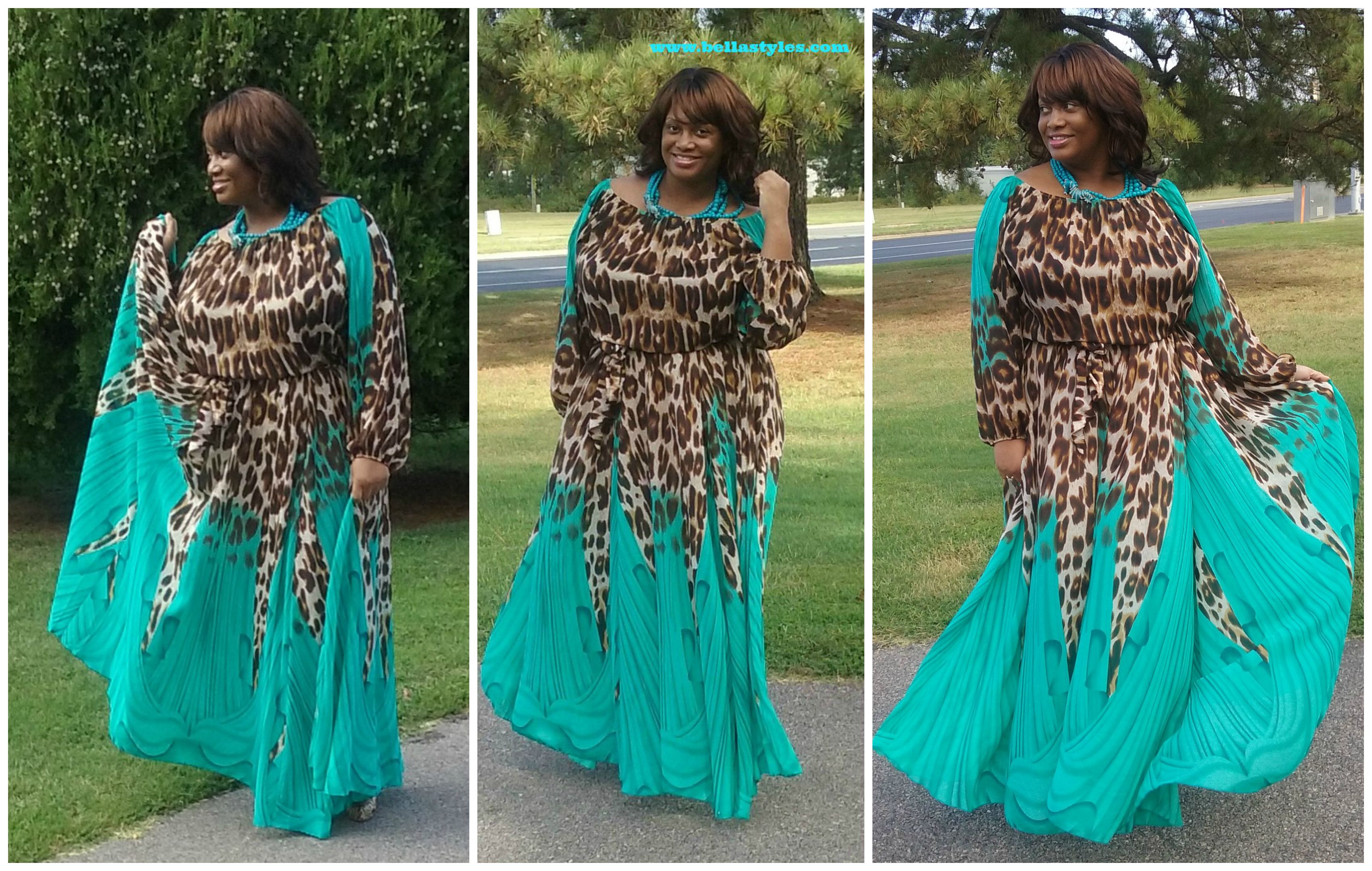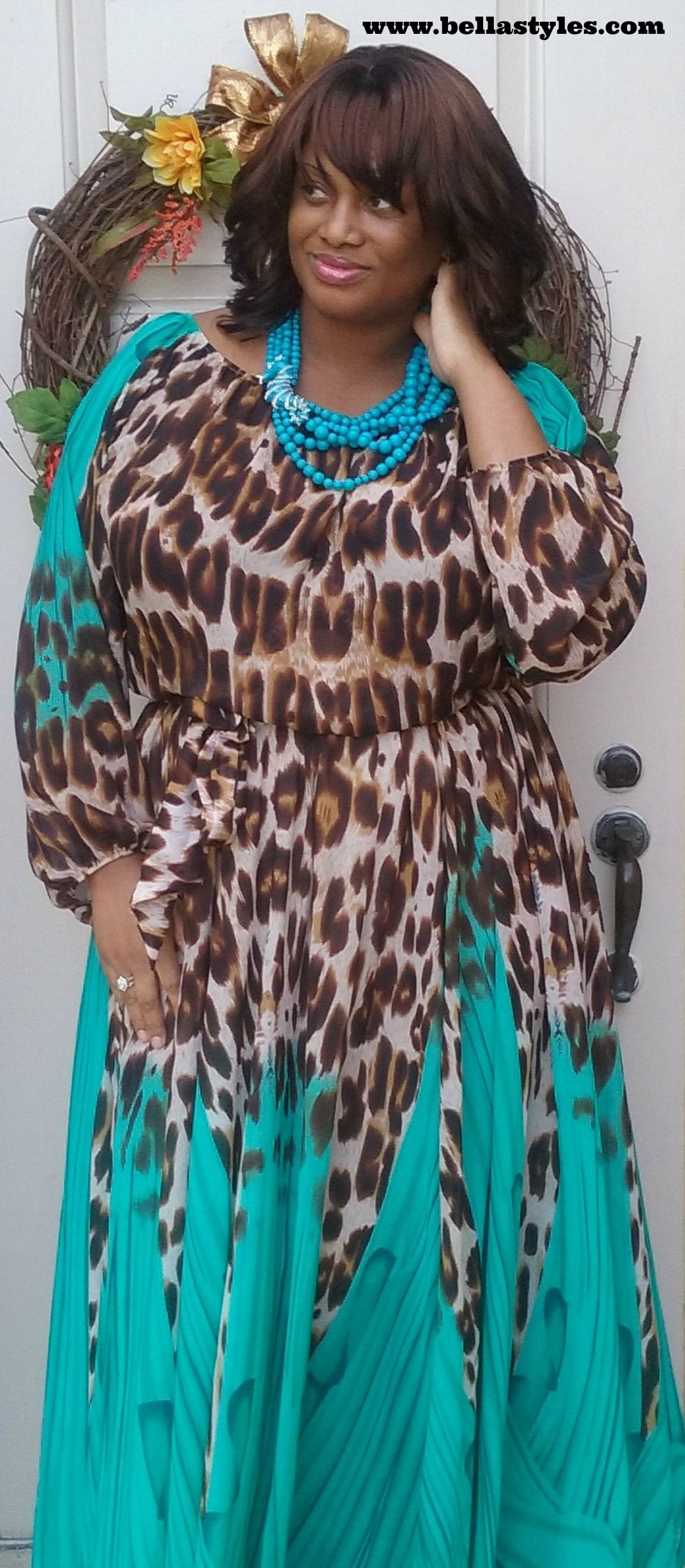 - Well what do you know, today is the first day of Fall. My how the summer flew past us. I didn’t hit the beach not once (sad face). But now that cooler days are here, comes the chance to bring out some Fall transition pieces. So to break in the new season, I’m wearing the chiffon turquoise cheetah maxi gown ($135) from Chic and Curvy Boutique. Being that I’m gonna celebrate my Birthday all week, I figured why not wear my most fabulous pieces all in a row. Even though the dress is sheer, it’s made with a lining from the waist to knee area so no worries about your ‘goodies’ showing through. The print of the gown is so overpowering that you really almost don’t need jewelry at all but since I happened to have a matching turquoise necklace in my stash I added that and cheetah pumps to match the animal print of the dress.