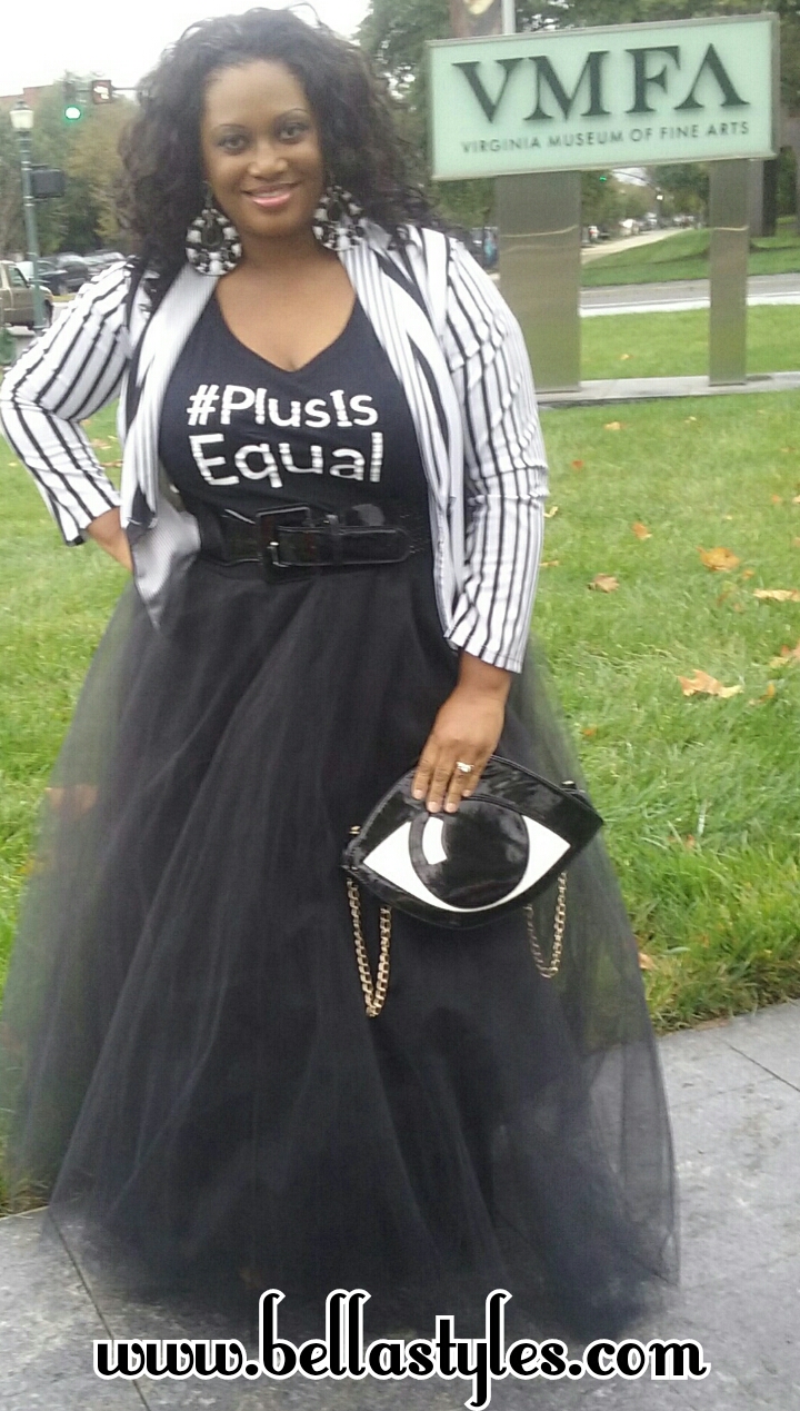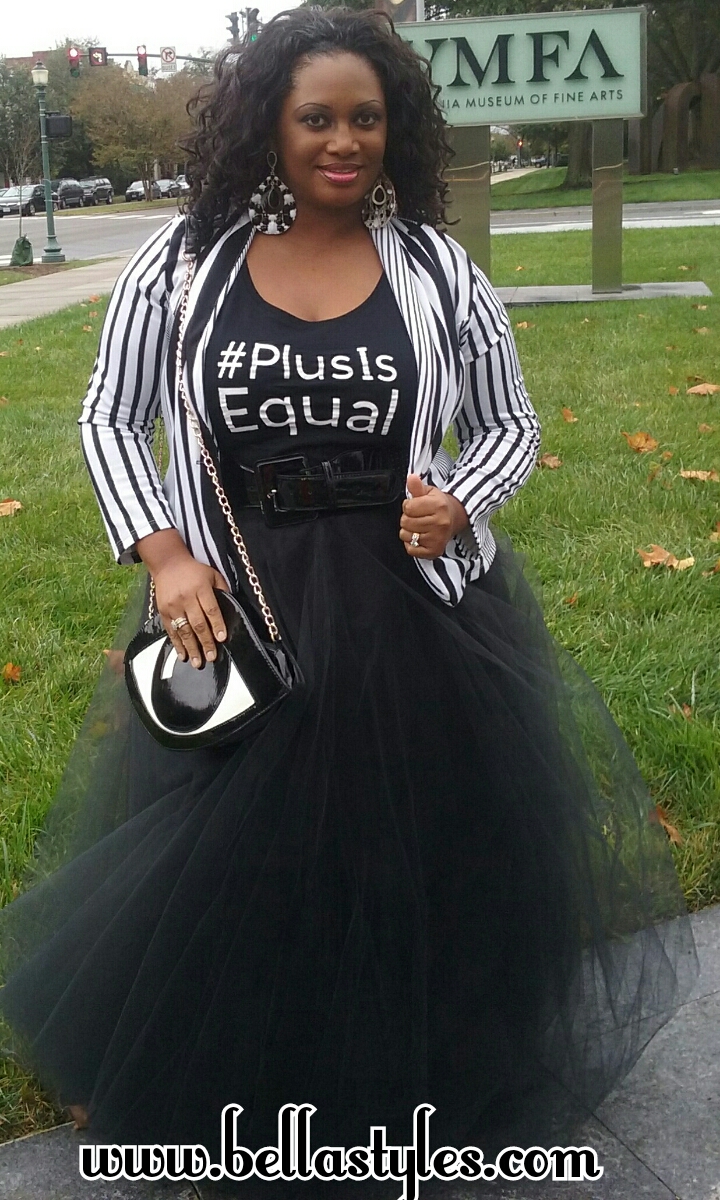 If you’ve been reading my recent posts, here and here, then you already know that I’m all over the latest Lane Bryant campaign called #PlusIsEqual. To my delight Lane Bryant even sent me one of the signature shirts a few weeks ago. So last night to help celebrate my Mom’s birthday I felt was the perfect time to bring it out and rep for the curvy ladies. As I’ve mentioned before here in RVA they have jazz nights at the museum and I knew that my Mom would be attending for her birthday so the kids and I surprised her and popped up. She’s always mentioning how all the fab Richmonders show up and show out in their gorgeous apparel which was all I needed to know to have the opportunity to break out my latest tutu from Chic and Curvy Boutique ($85).