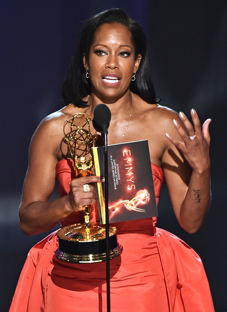 Regina King accepts the award for outstanding supporting actress in a limited series or movie for “American Crime” at the 68th Primetime Emmy Awards on Sunday, Sept. 18, 2016, at the Microsoft Theater in Los Angeles. (Photo by Vince Bucci/Invision for the Television Academy/AP Images)