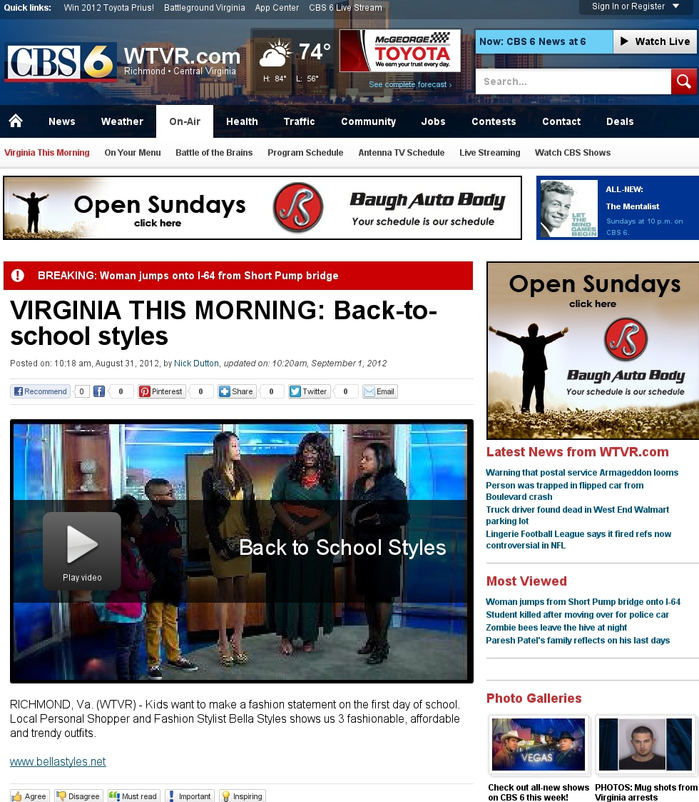August 31, 2012- Guest on CBS “Virginia This Morning” for a segment on ‘Back To School Fashion’. Interviewed by Cheryl Miller